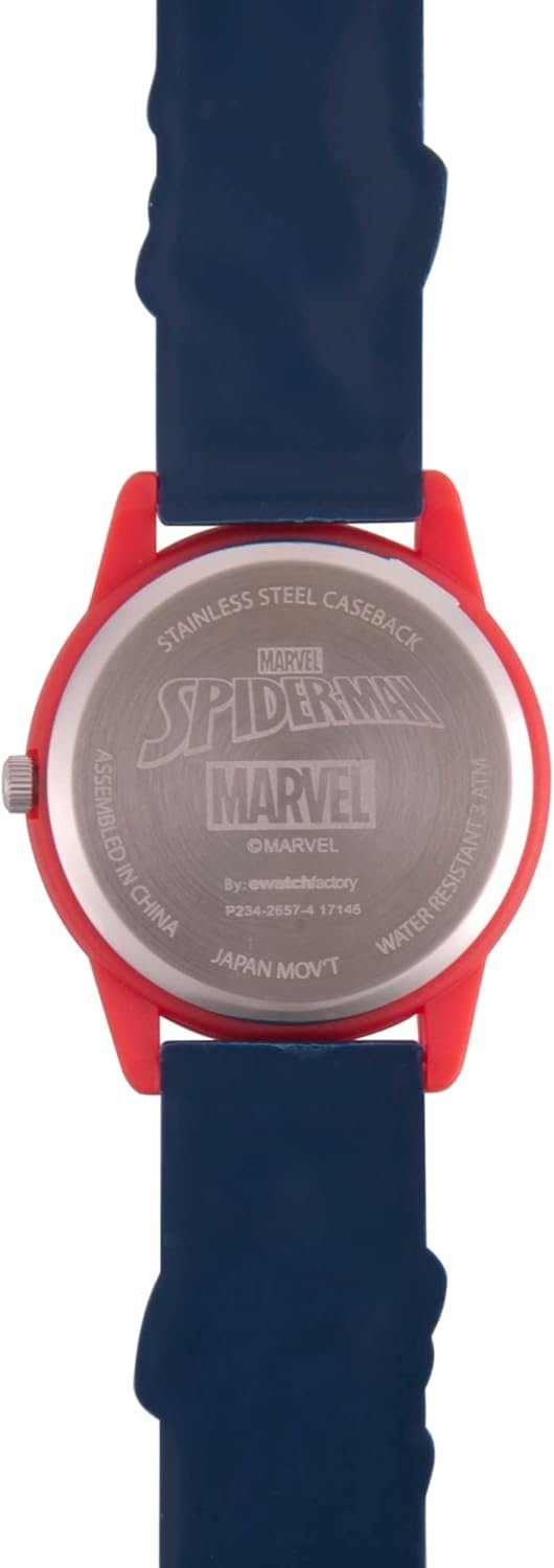 Marvel Spider-Man Boys’ Red Plastic Time Teacher Watch. 32mm Plastic case, 16mm Spider-Man 3D Strap, dial features Spider-Man. Mineral glass crystal, stainless steel case back, Japan quartz movement, water resistance to 100 feet.